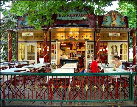 It’s a treat in itself to visit such a place, and watch the chef at work, in his whites, filling the shallow hollows in the huge, gas-heated hotplate in front of him with a liquid batter. After a few minutes, he flips the now puffed-up ‘poffertjes’ over, and when they are nicely browned and done, he’ll serve them, freshly-made and piping hot, in portions of 6 on a cardboard plate, with a dollop of butter and a generous sprinkling of icing sugar, and a small, disposable wooden fork.